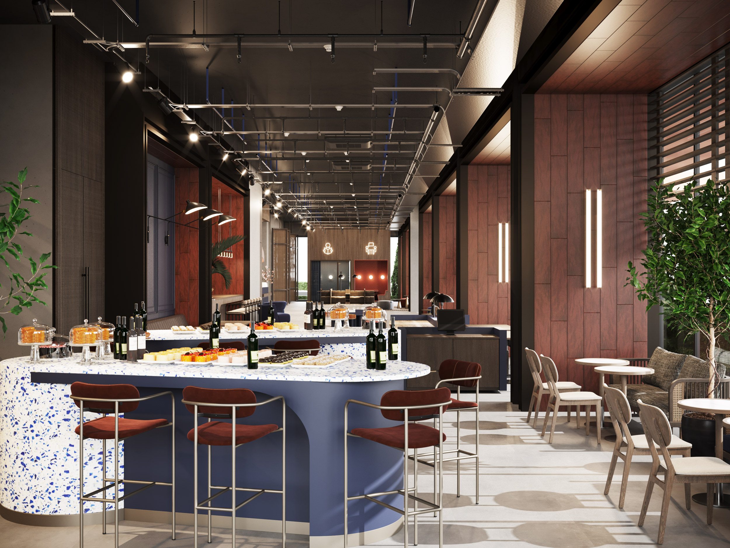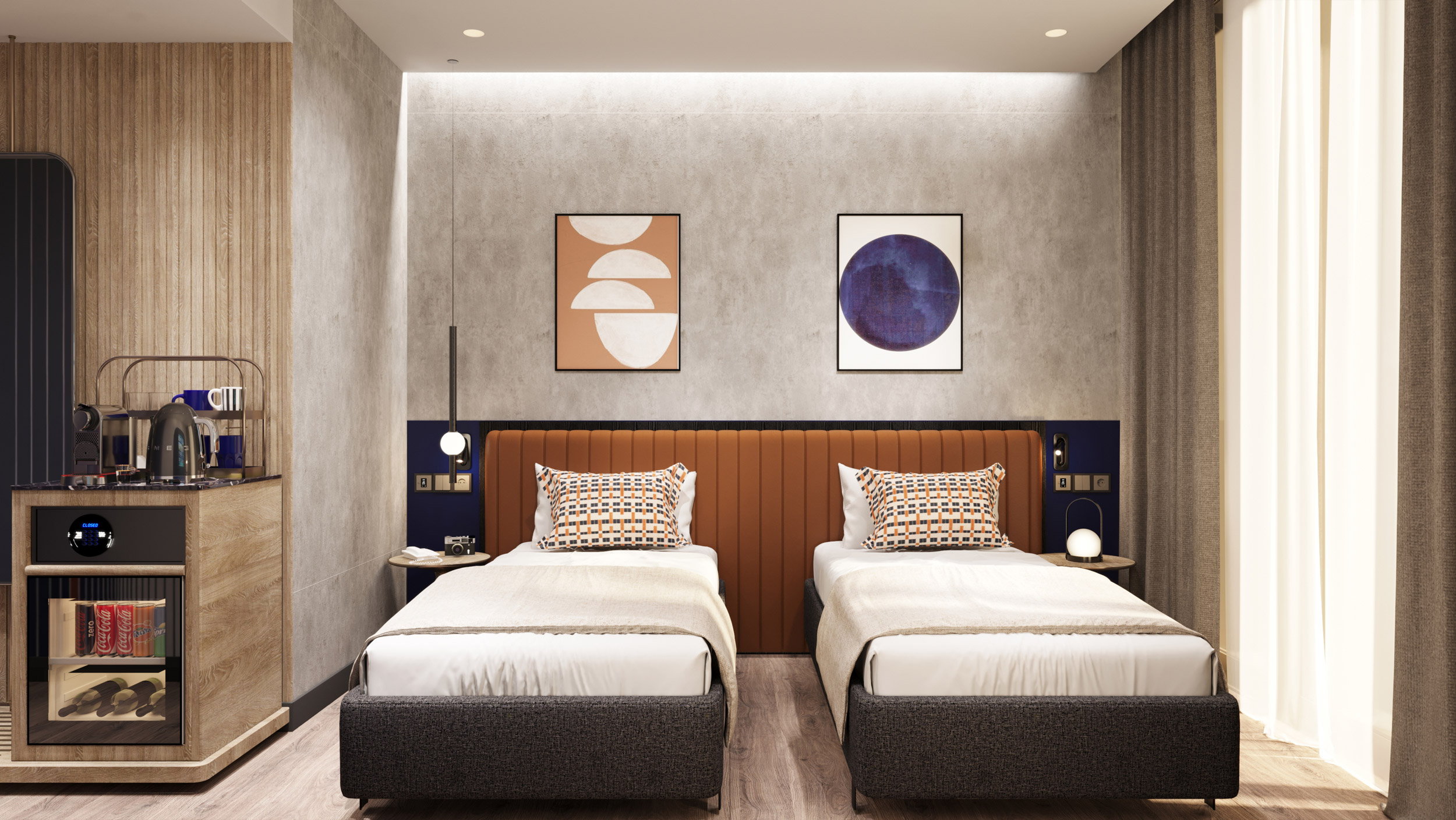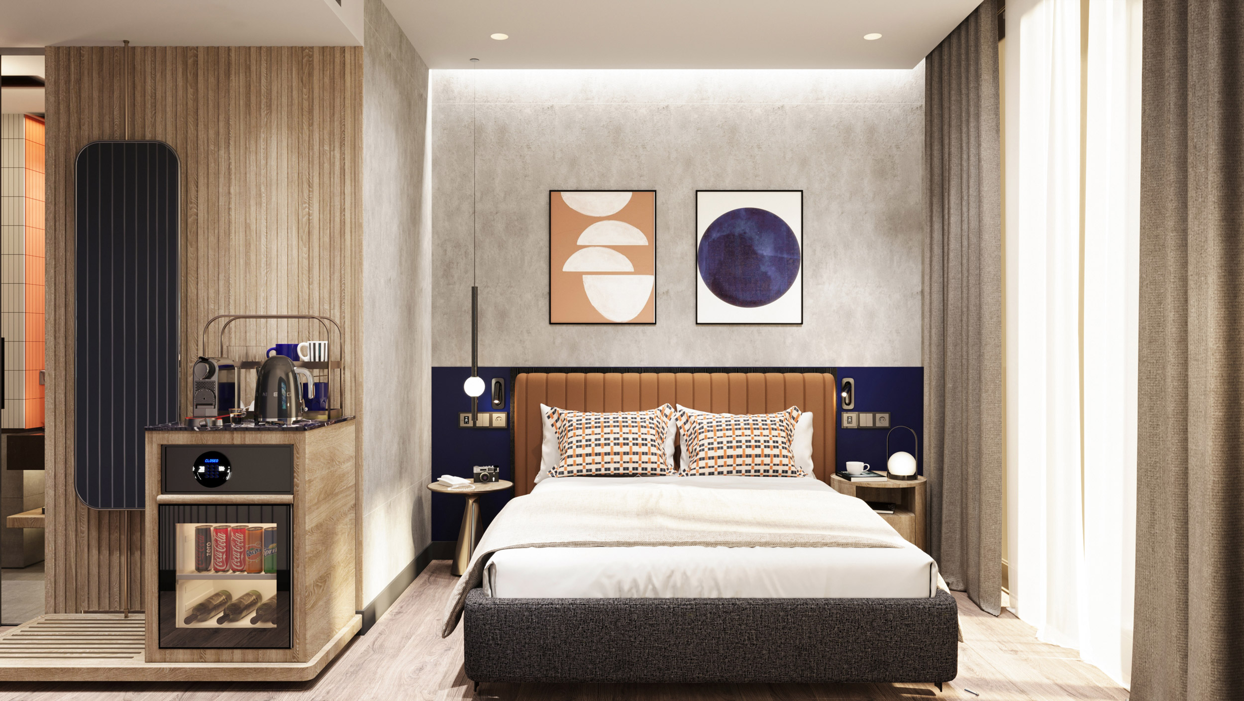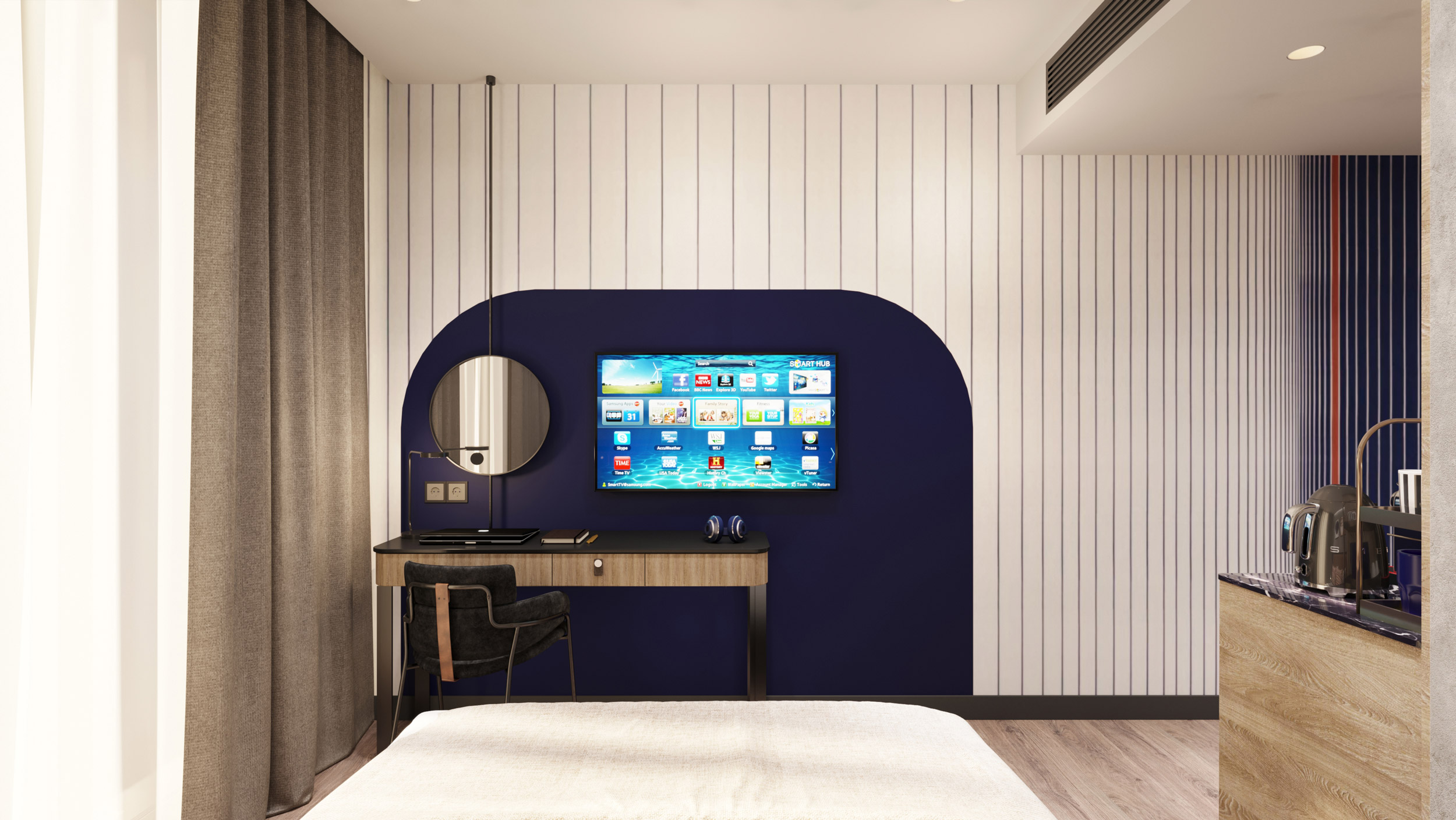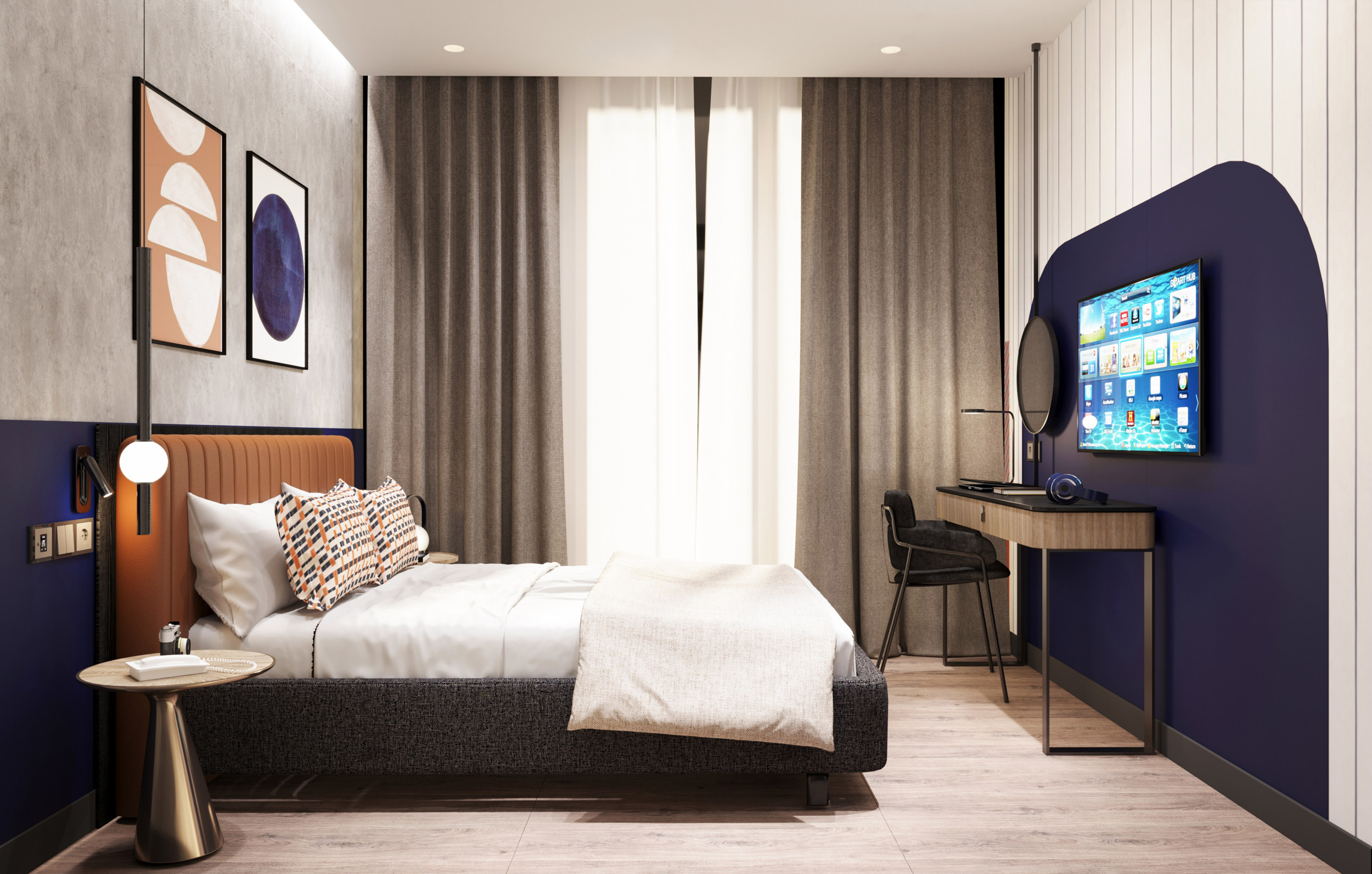 The impressive 3D renders of “Go by Elite World Hotels” vividly capture the hotel’s vibrant concept, making them appear almost photorealistic. These renders effectively convey the dynamic design elements, from the striking gray and electric blue color scheme to the inviting social spaces and stylish guest rooms. Each image showcases the meticulous attention to detail and innovative design, offering a captivating preview of the exceptional experience awaiting guests.