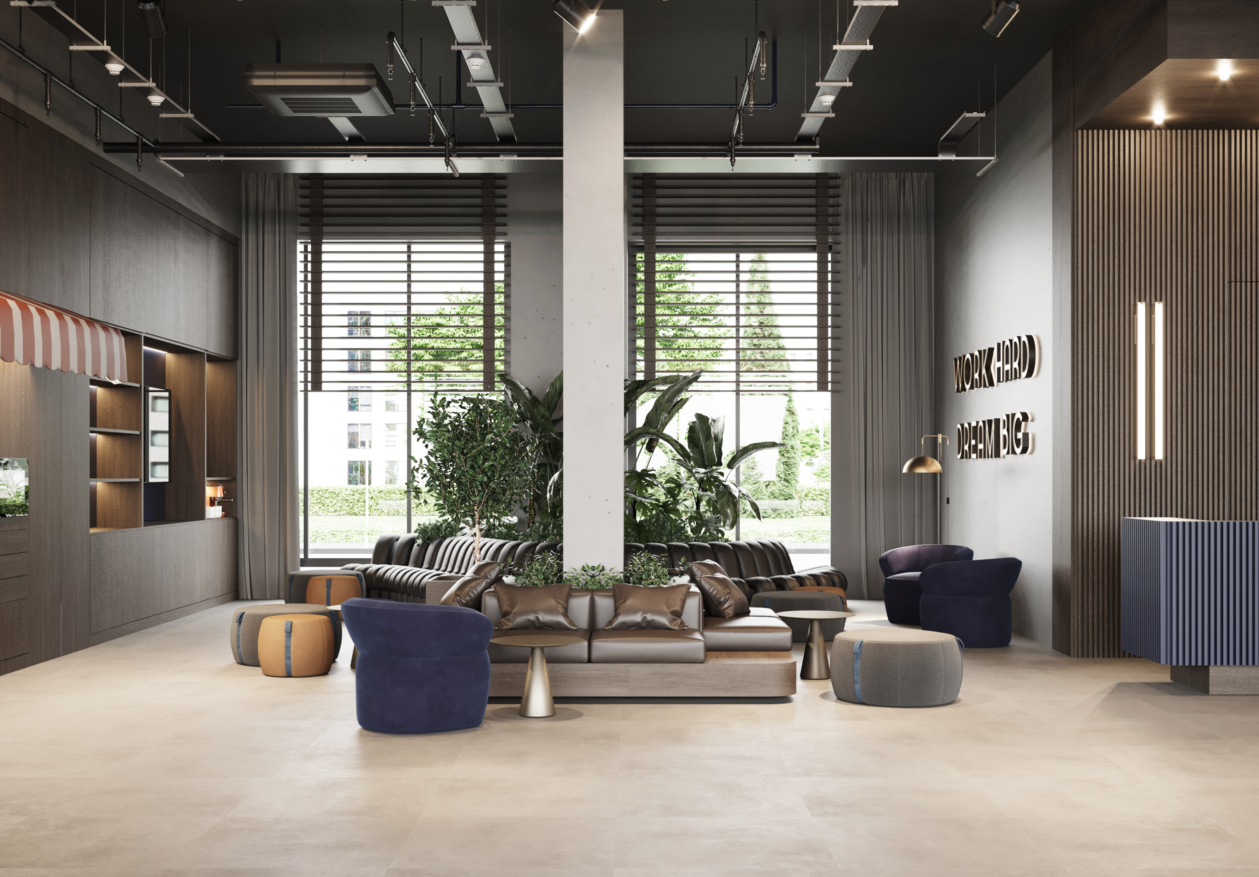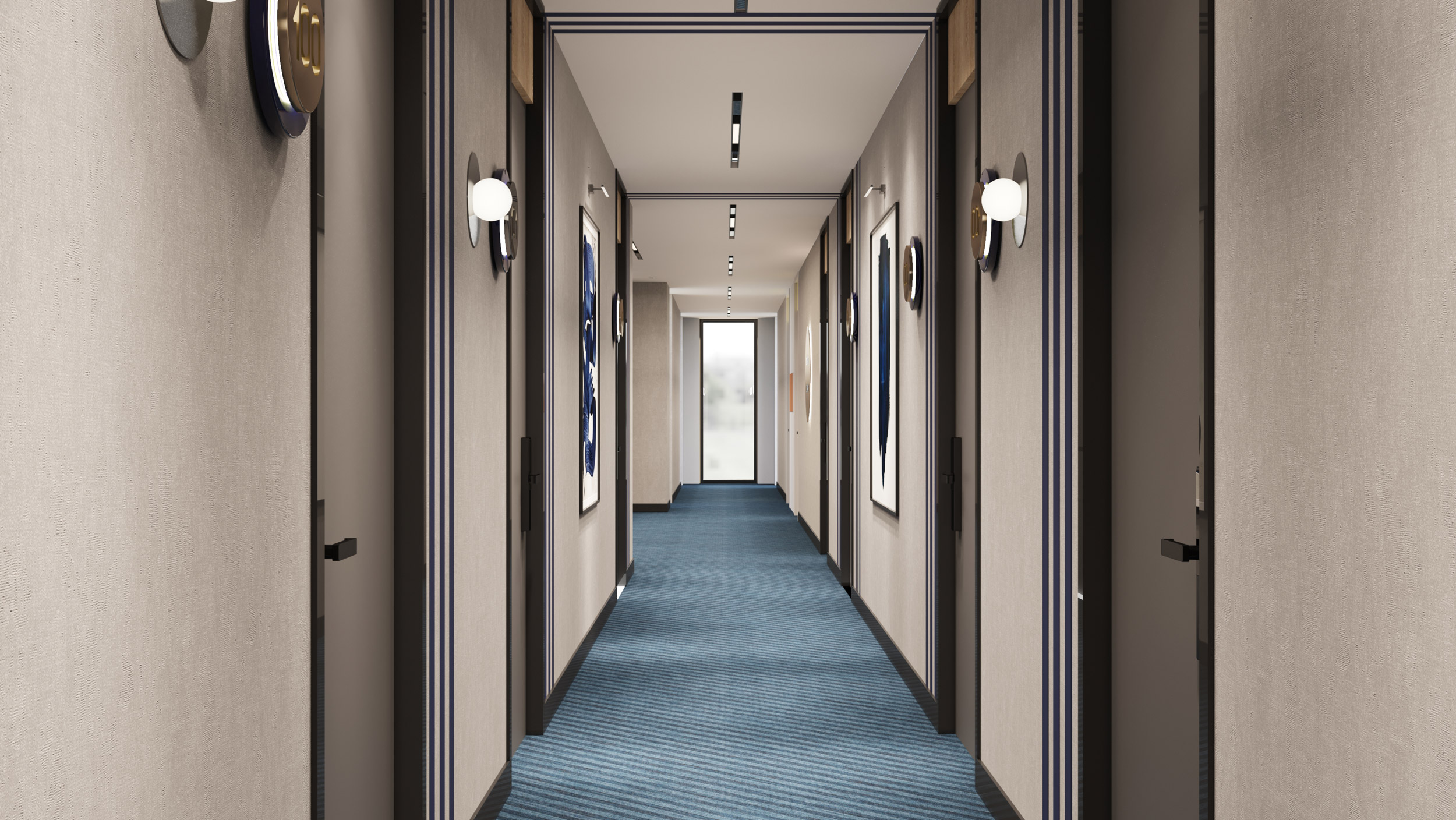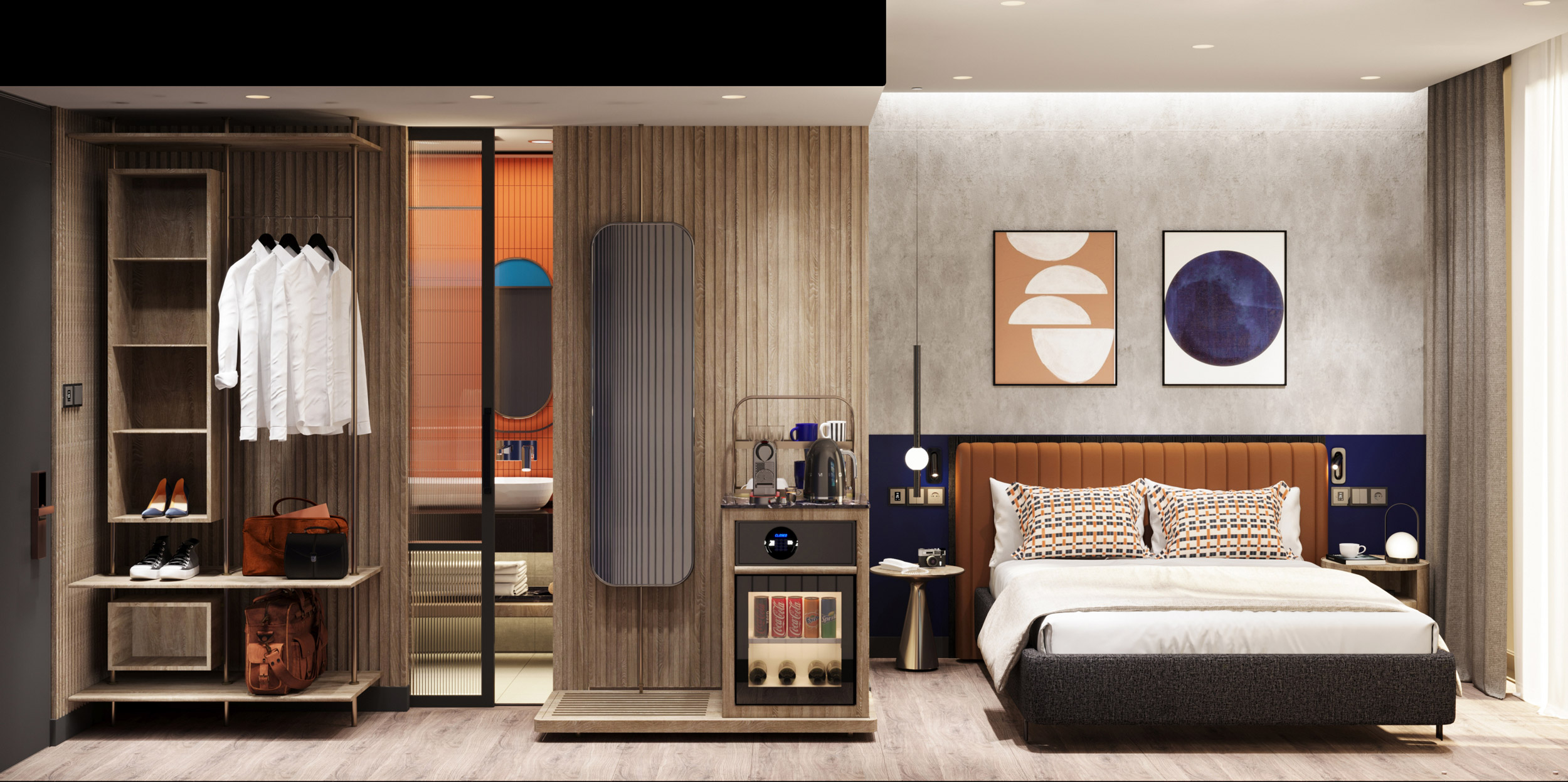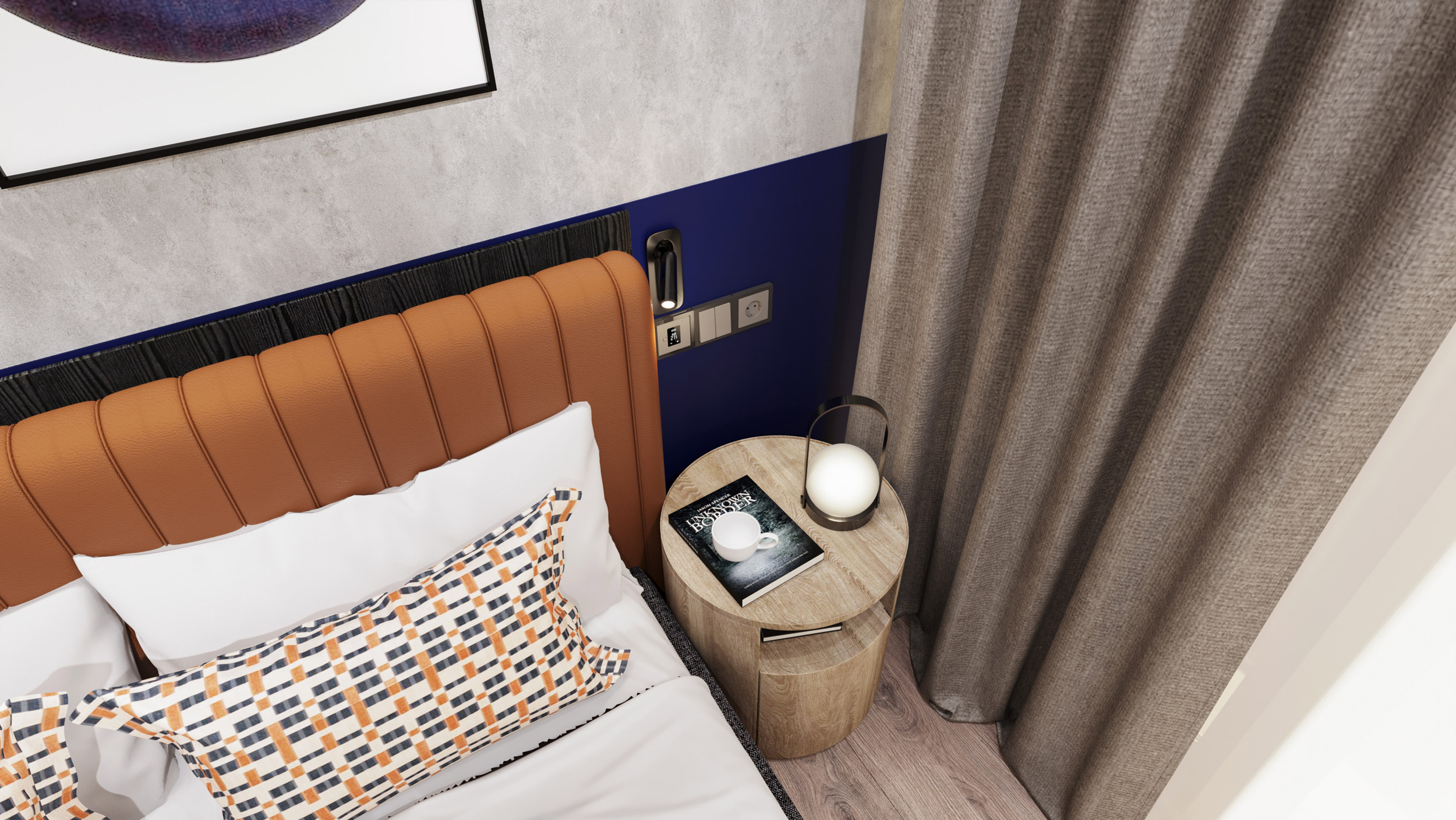 The impressive 3D renders of “Go by Elite World Hotels” vividly capture the hotel’s vibrant concept, making them appear almost photorealistic. These renders effectively convey the dynamic design elements, from the striking gray and electric blue color scheme to the inviting social spaces and stylish guest rooms. Each image showcases the meticulous attention to detail and innovative design, offering a captivating preview of the exceptional experience awaiting guests.