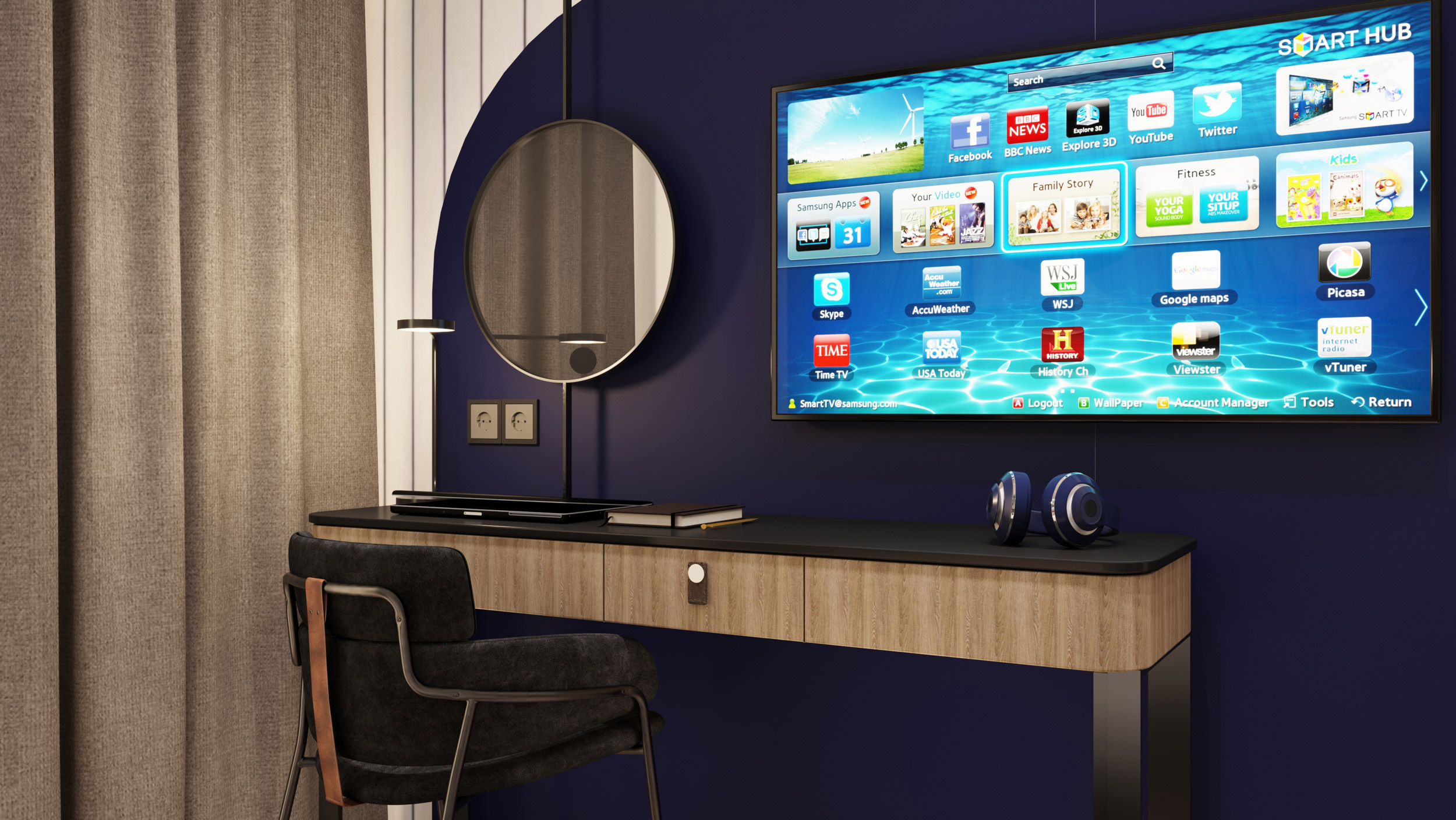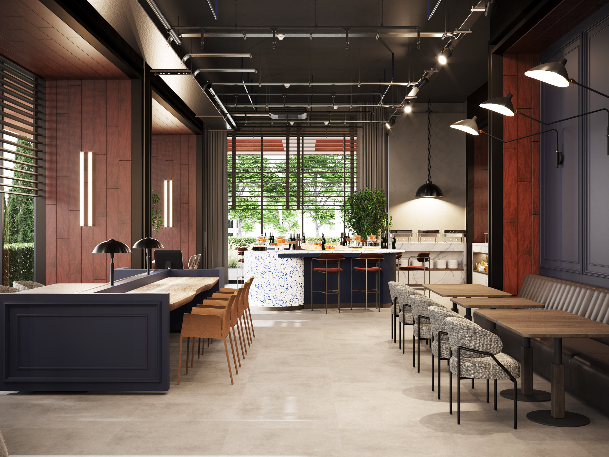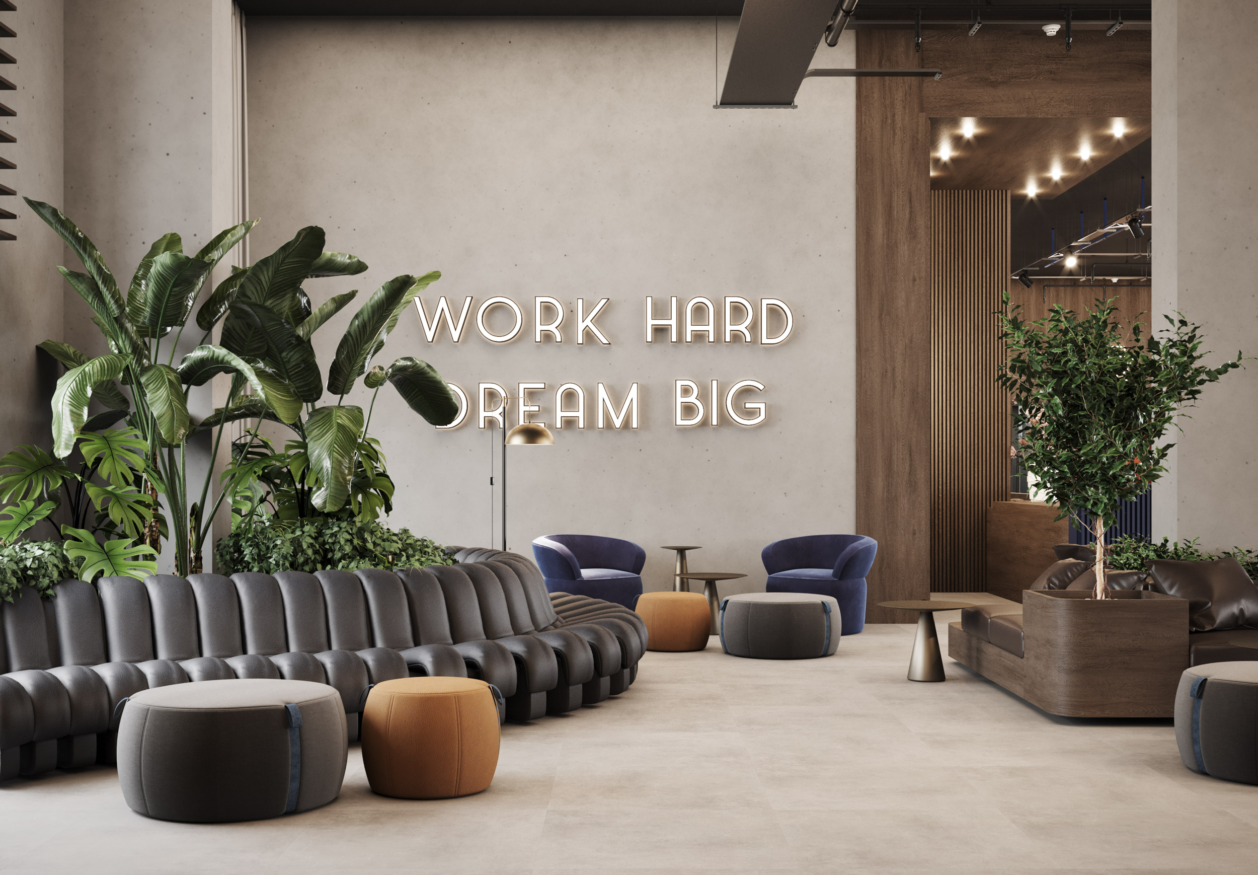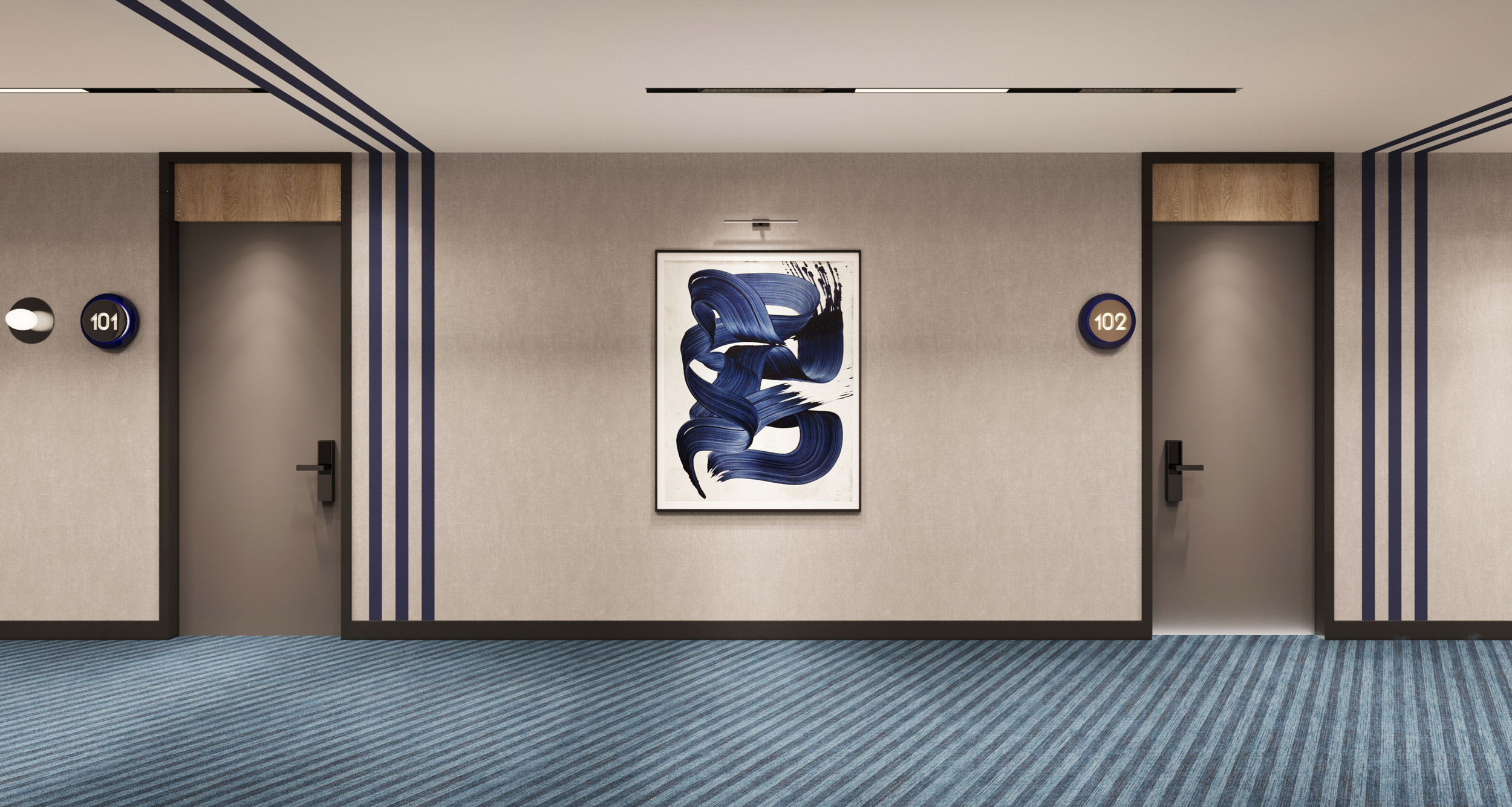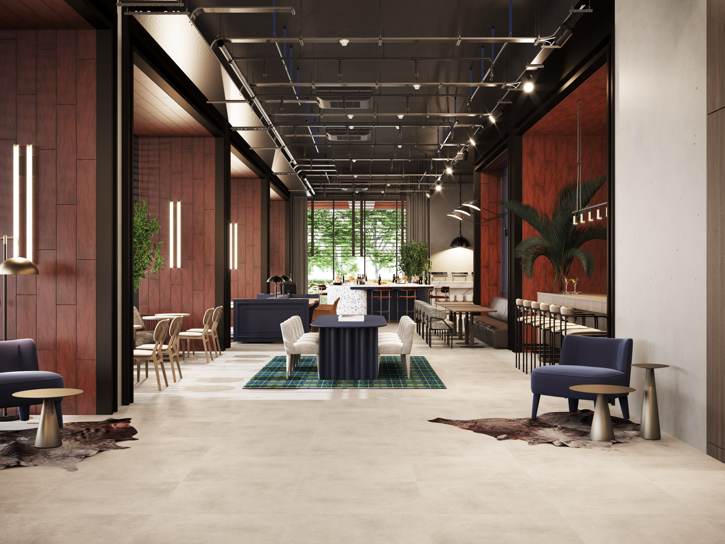 The impressive 3D renders of “Go by Elite World Hotels” vividly capture the hotel’s vibrant concept, making them appear almost photorealistic. These renders effectively convey the dynamic design elements, from the striking gray and electric blue color scheme to the inviting social spaces and stylish guest rooms. Each image showcases the meticulous attention to detail and innovative design, offering a captivating preview of the exceptional experience awaiting guests.