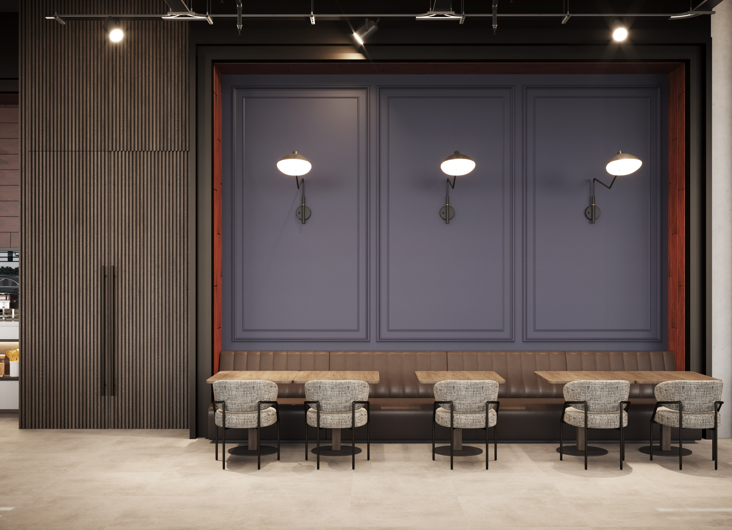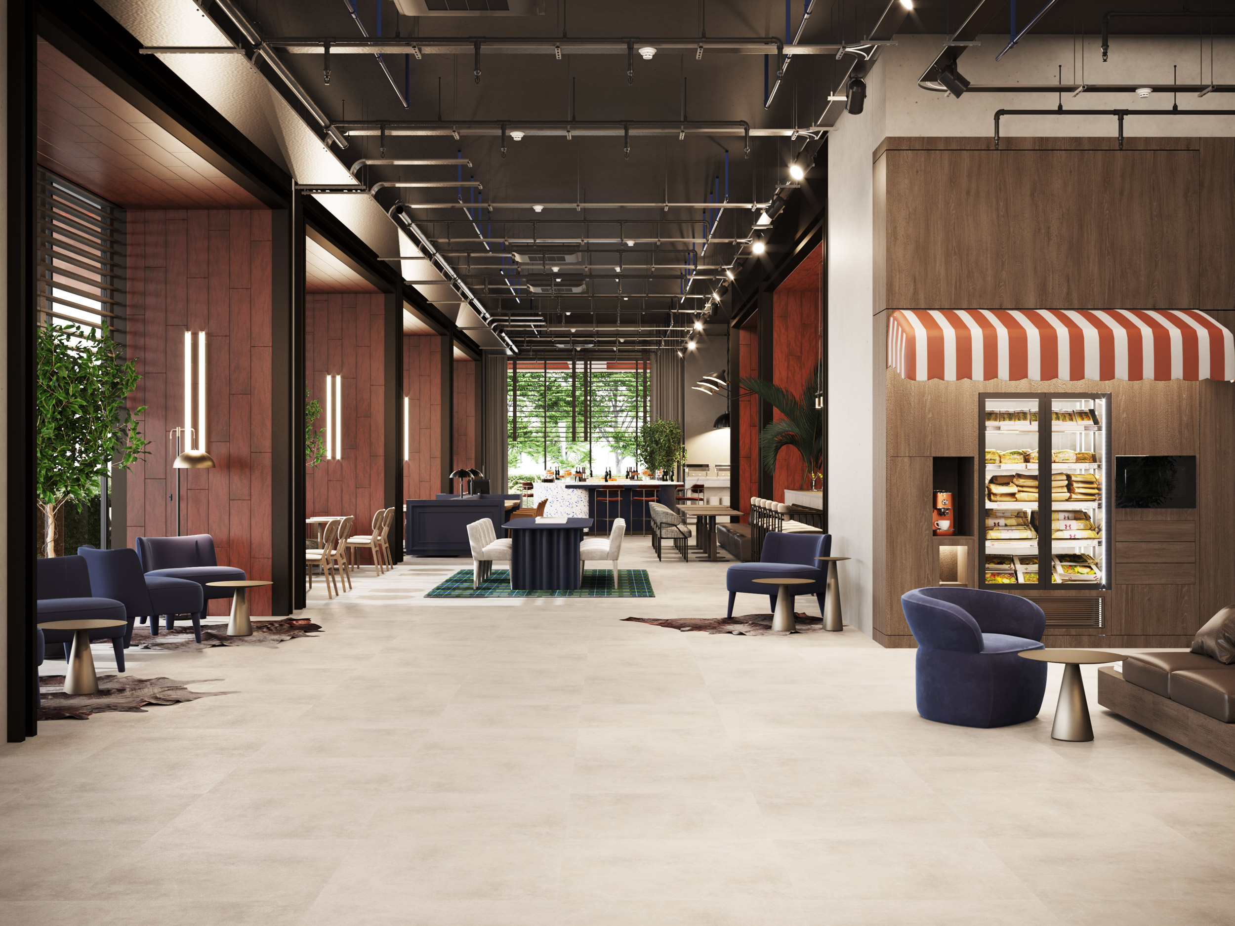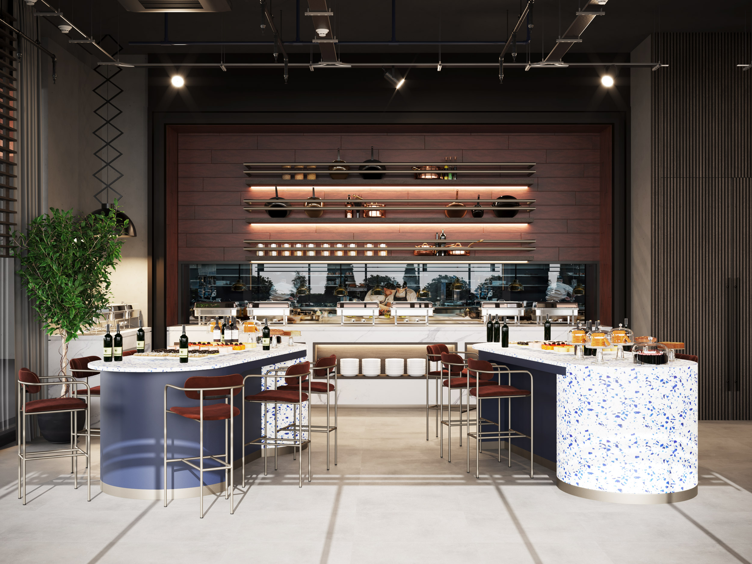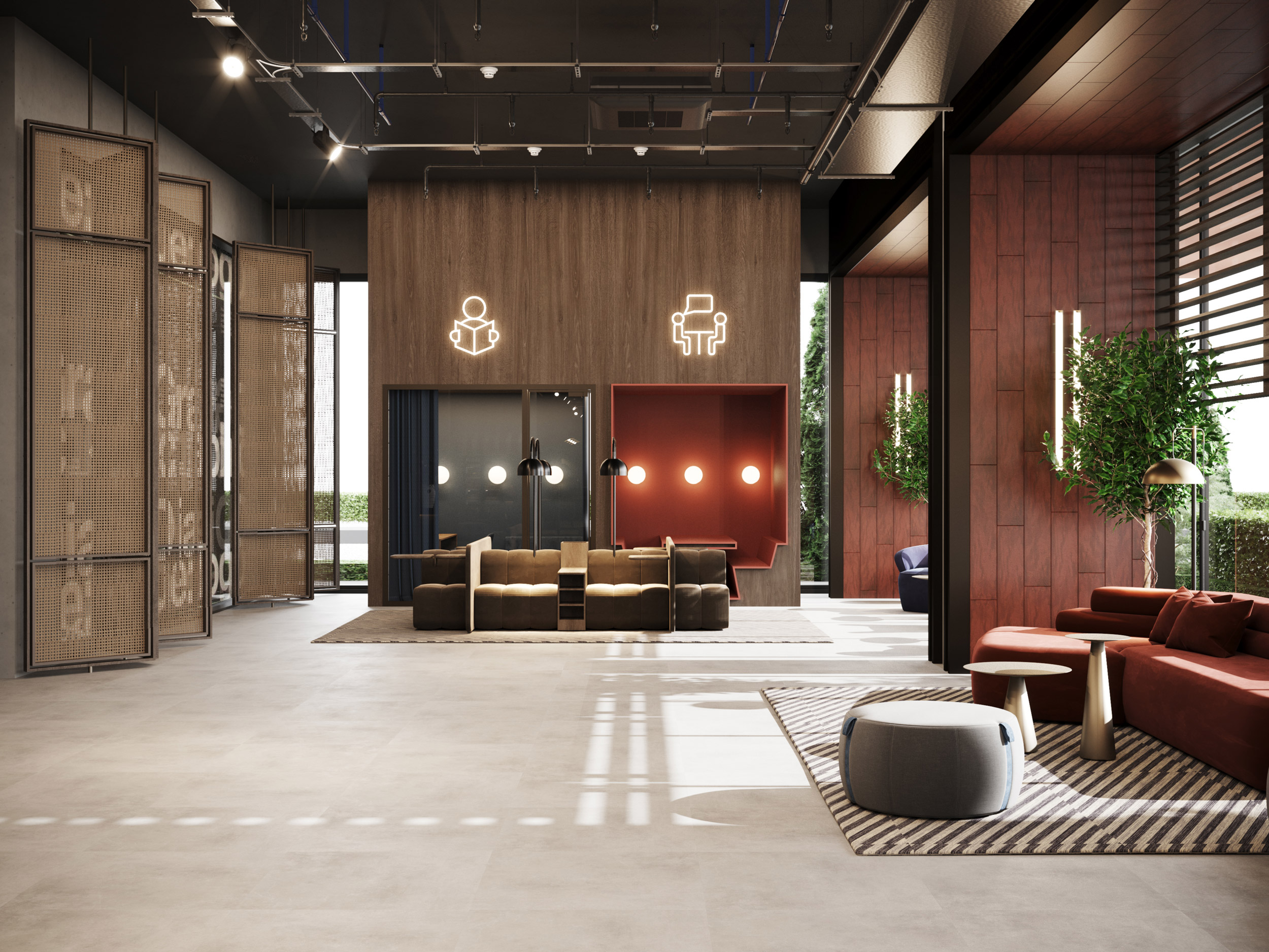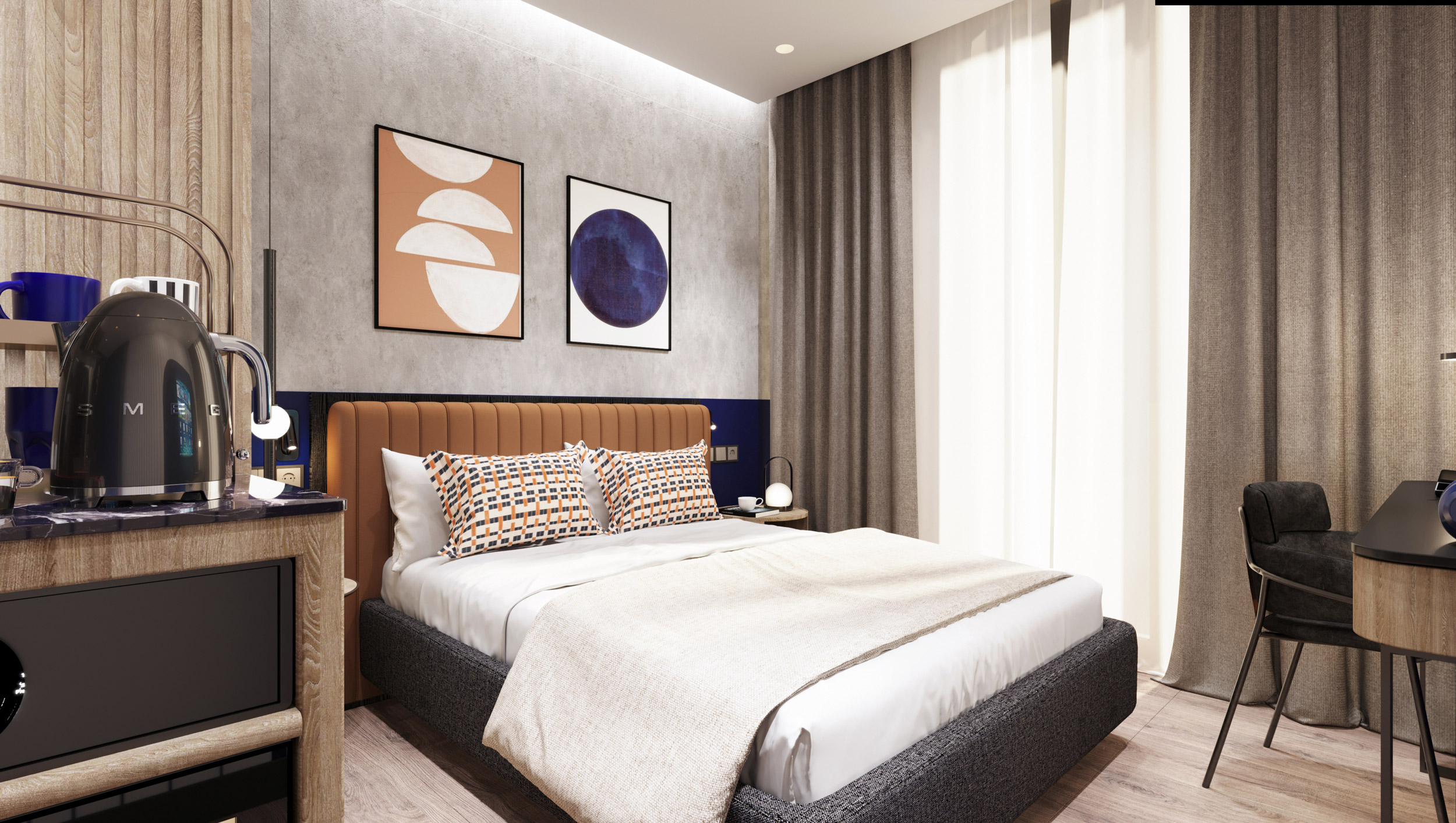The concept developed for the Elite World Hotels brand, “Go by Elite World Hotels,” stands out as a budget-friendly three-star city hotel specifically designed for young travelers and dynamic business guests. The striking combination of gray and electric blue in the design, enriched with leather and earth tones, creates a youthful and energetic atmosphere. The spacious and transparent reception area includes a modern restaurant, lobby bar, and specially designed workspaces for business travelers. Technological amenities provided in every corner of the hotel enhance guests’ comfort and efficiency. The restaurant offers enjoyable coffee accompaniments throughout the day, and the impressive lobby bar serves as a social gathering spot in the evenings, enriching the hotel’s social living areas.